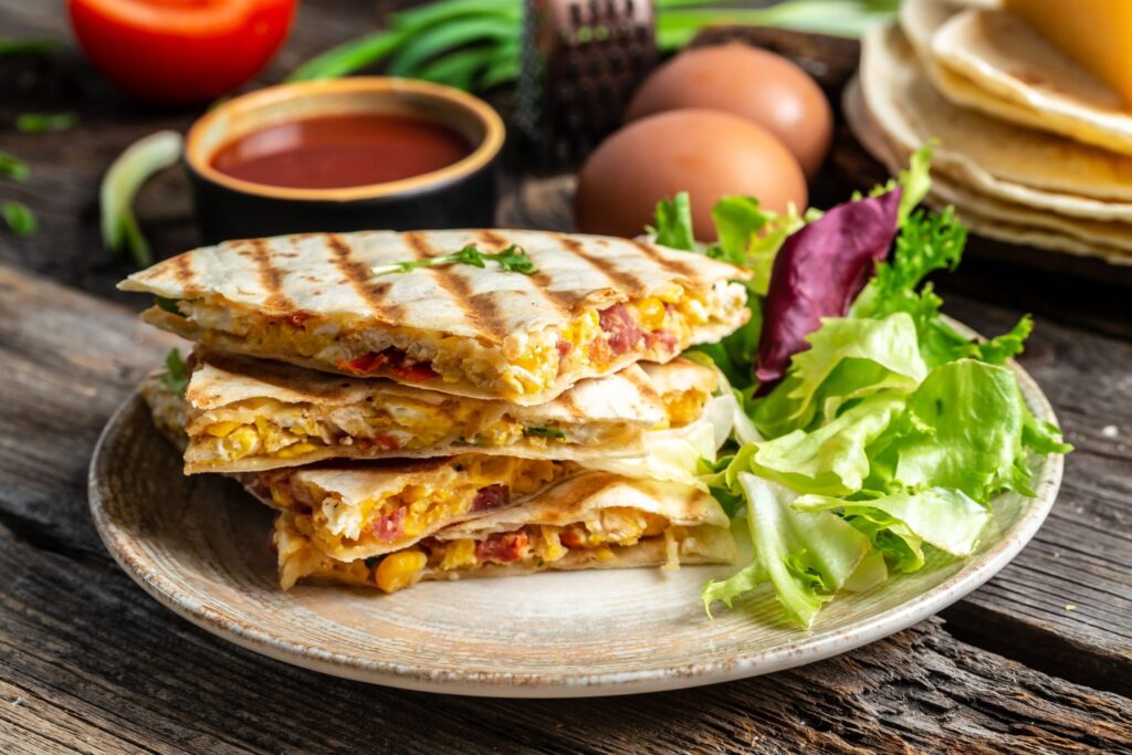 - Clean skillet; place a tortilla in skillet over medium heat. Sprinkle half of cheese over tortilla. Top with egg mixture. Sprinkle remaining cheese over egg mixture. Place other tortilla on top; press down.