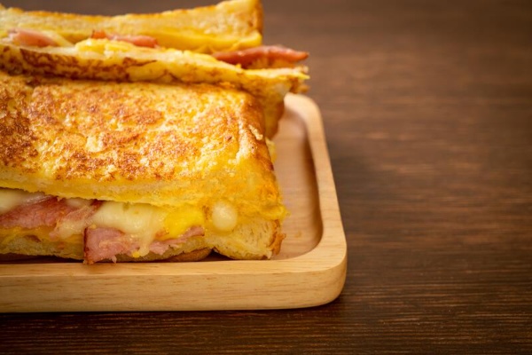- Spread remaining butter evenly on 1 side of each bread slice. Place 2 slices in skillet, buttered side down. Top evenly with scrambled eggs, cheese, and bacon. Cover with remaining bread, buttered side up.